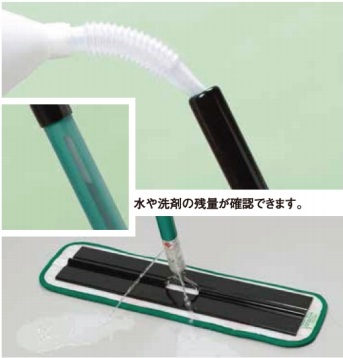 ハンドル内に水や洗剤を注入し必要時にハンドル上部のボタンを押すことで、床面に放出させながらのお掃除が可能です。汚れが気になるところへは多めに水や洗剤をかけモップ清掃することで、効率よく作業できます。