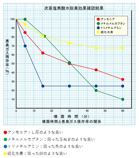 - 次亜塩素酸は自然分解性が高く、菌や有機物に反応・分解後は、人体環境に無害な水へ、すぐに変化します。
