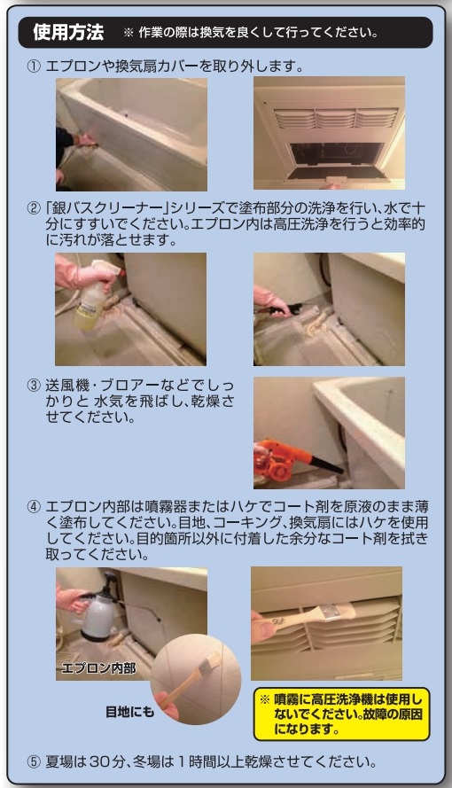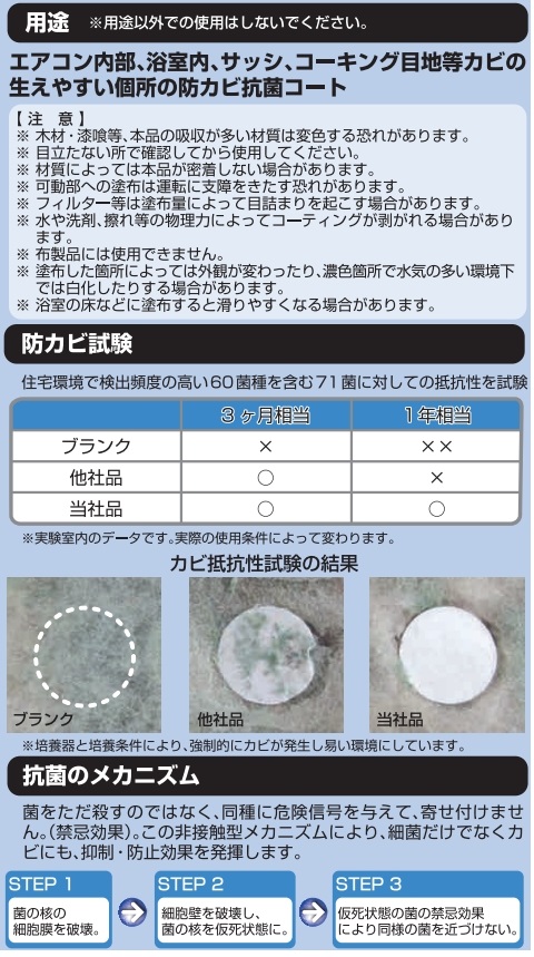 • 浴室内の壁面の目地・コーキング、エプロン内・換気扇の防カビ剤としても使用可。