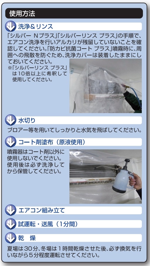 1. 「シルバーNプラス」「シルバーリンスプラス」の手順で、エアコン清掃を行いアルカリ分が残留していないことを確認してください。「シルバーエアコン防カビ・抗菌コート」噴霧時に、周辺への飛散を防ぐため、洗浄カバーは装着したままにしておいて下さい。