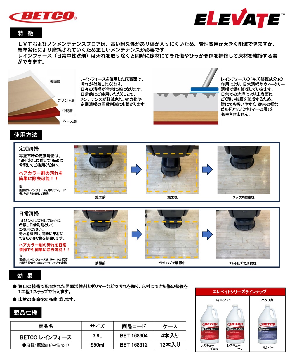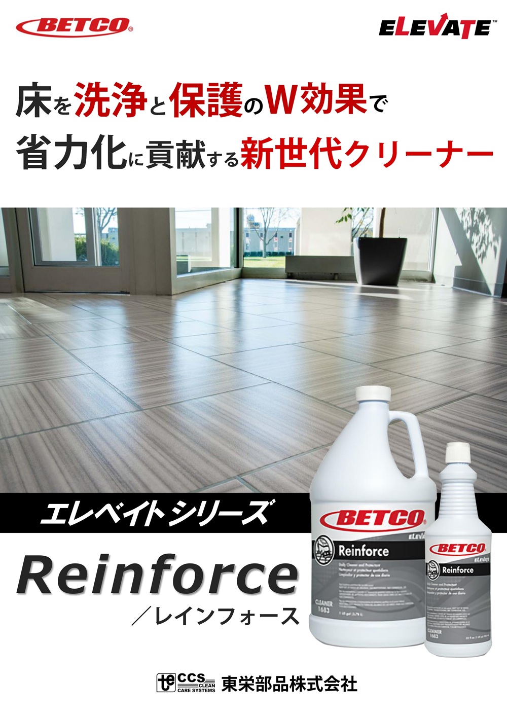 LVTおよびノンメンテナンスフロアは、高い耐久性があり傷が入りにくいため、管理費用が大きく削減できますが経年劣化により摩耗されていくため正しいメンテナンスが必要です。レインフォース(日常中性洗剤)は汚れを取り除くと同時に床材にできた傷やひっかき傷を補修して床材を維持する事ができます。