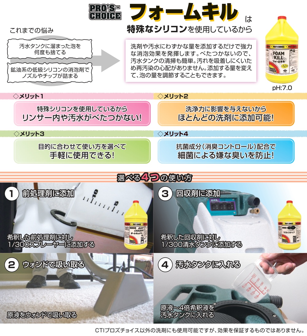 • フォームキルは良質なシリコンを使用しているため、僅かな量で消泡効果があり、タンクやホース内がべとつくことはありません。また、洗浄力に影響を与えないので、前処理剤や回収剤にも添加が可能で、今まで入れることのできなかったスプレーヤーや清水タンクに入れて使用することができます。