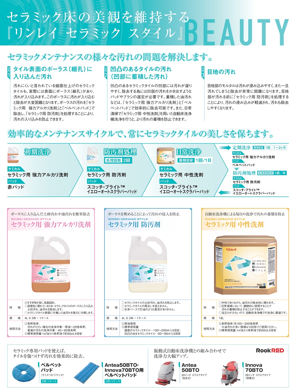 • 床材への浸透性に優れ、ポーラスに入り込みくすみ、黒ずみ汚れを除去するセラミック洗剤です。