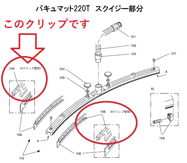 シーバイエス ウェットバキューム バキュマット220T用パーツ スクイジー交換クリップを販売しております。床面の汚水を回収するスクイジーゴムを支えるパーツです。1台に8枚必要です。スクイジーゴム交換時に、一緒に交換することをおすすめします。その他の、部品パーツも豊富の取り揃えております。販売していないパーツ部品は、ページに掲載されています、パーツリストをご覧いただき、番号をお問い合わせ下さい。お取り寄せ致します。