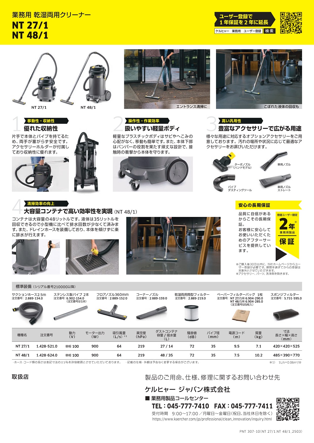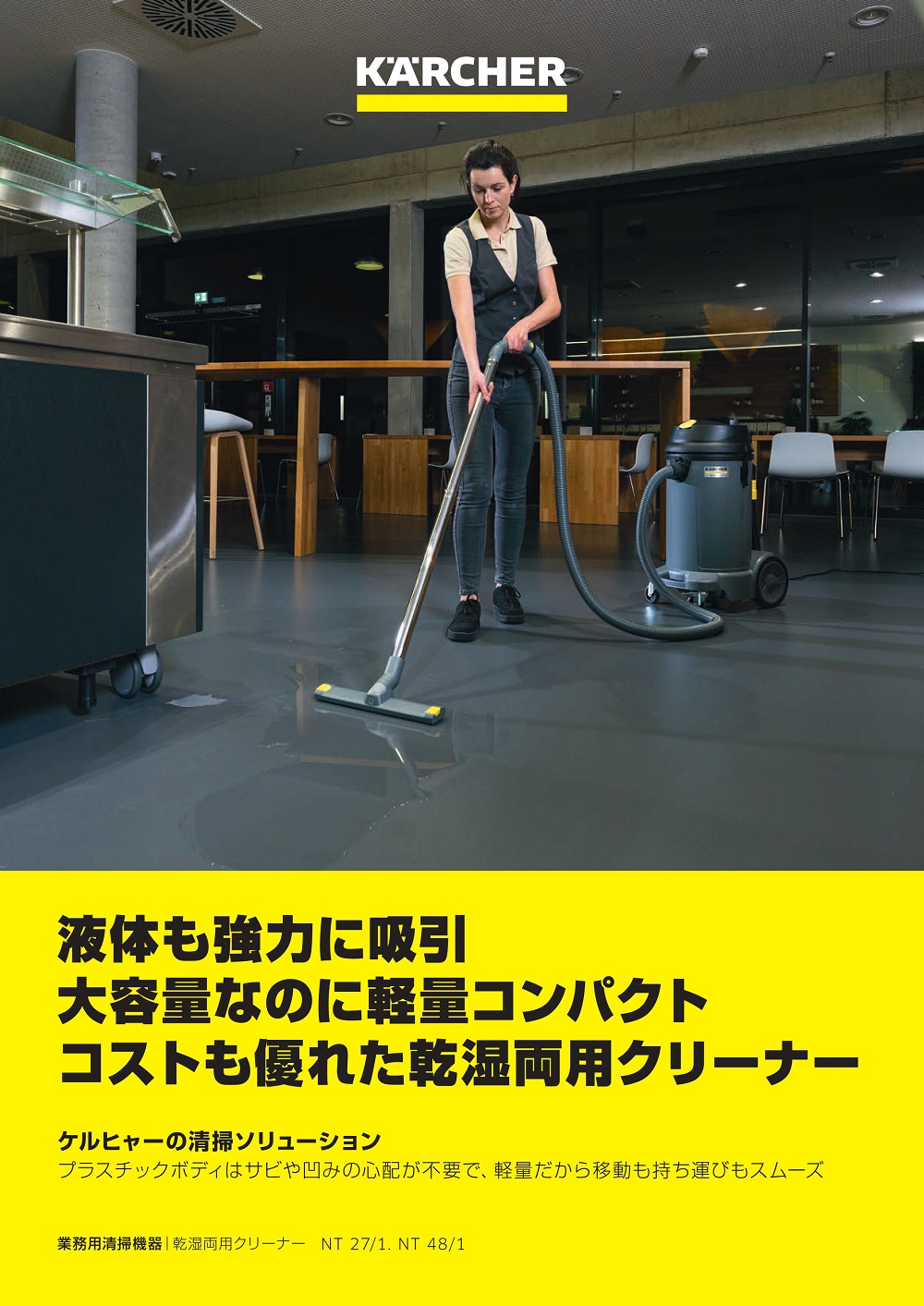 • NT 48/1はハイパワーのケルヒャー業務用乾湿両用クリーナーです。ハイパワーでありながら、軽くて丈夫なプラスチックボディと豊富なアクセサリーが特徴の大容量タイプです。