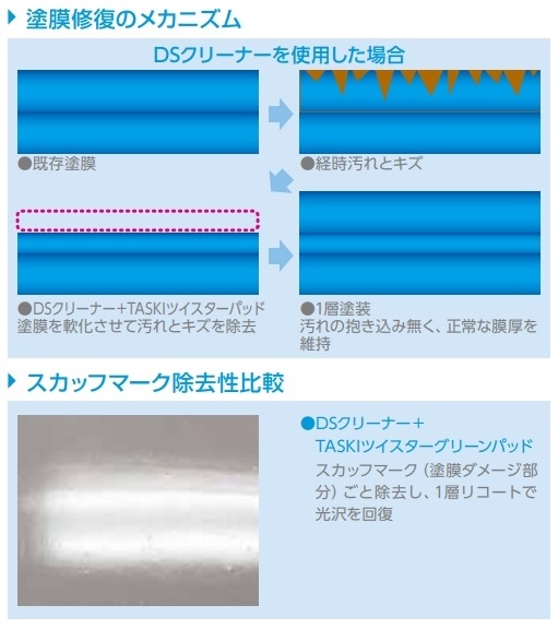 汚れの抱き込みを防止高浸透力のアルコール系溶剤を豊富に含有。キズの中に入りこんだ汚れを浮き立たせながら効果的に除去するので、汚れの抱き込みを防ぎます。