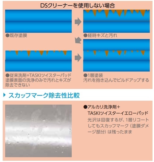 塗膜のビルドアップを抑制 TASKIツイスターパッドとの組み合わせでアルコール系溶剤が軟化させた塗膜を平滑に研削するので、適正な膜厚を維