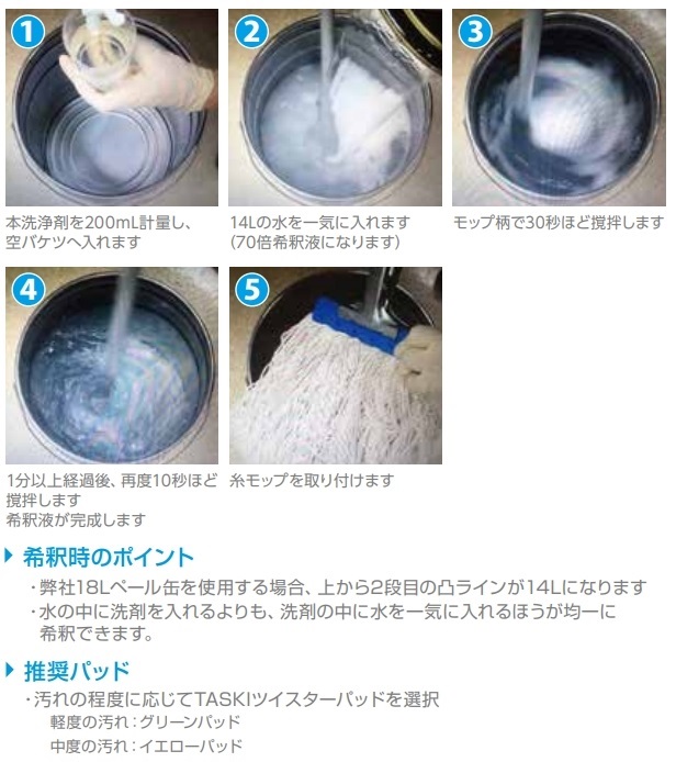 - 70倍希釈(許容範囲:60~80倍希釈 ※60倍より濃くしないでください。)