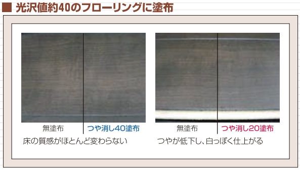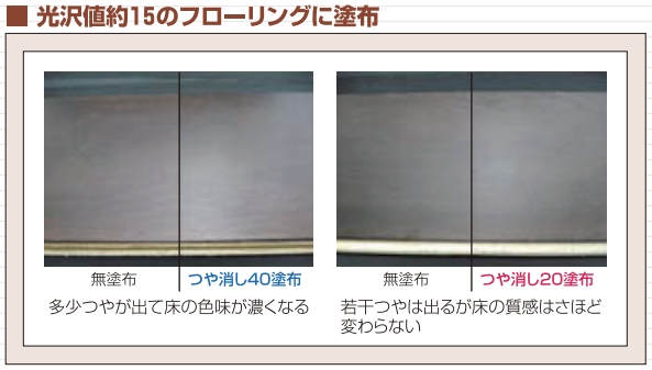※光沢値20以下のフローリングに適します。設定値(光沢値約20)より光沢の高いフローリングに使用すると、白っぽく仕上がることがあります。事前に光沢計でフローリングの光沢値を確認し、ワックスを選定することをおススメします。