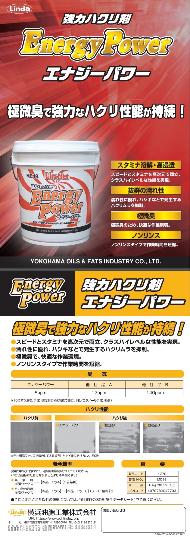 • 「エナジーパワー」は、極美臭で強力なハクリ性能が持続する強力ハクリ剤です。