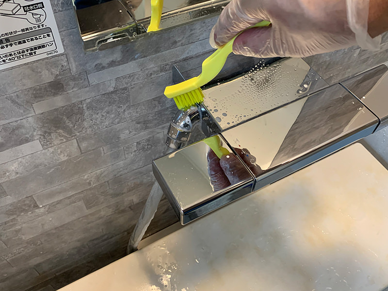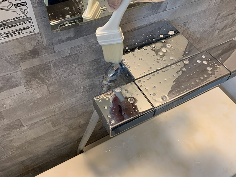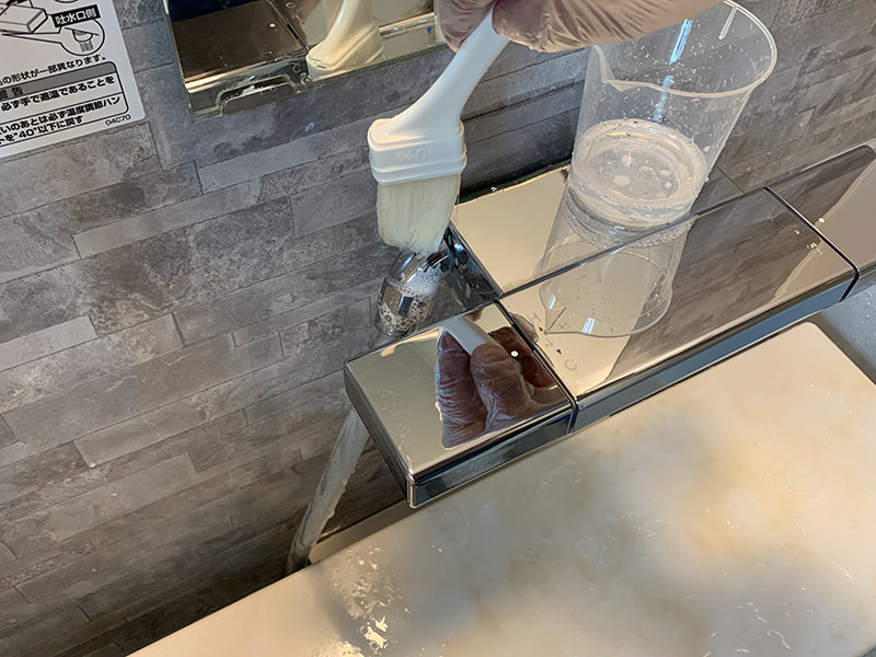 ピッカランの2倍希釈洗剤を薬品ハケで、カランに塗布します。