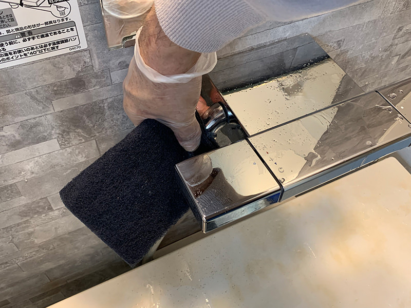 水あかを落とすには酸性洗剤が効果的です。しかし金属にはダメージを与えます。だからといって、カランの水あか汚れを、力ずくで磨きますと、カラン・蛇口表面が、ガサガサになります。そこで、金属に使えるように調整された酸性洗剤を使用して、水あかを分解しながら、物理的に磨きを最小限にすることがポイントとなります。