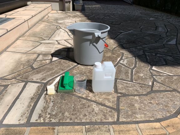 庭の天然石(乱形石)の黒ズミ汚れを落すために使った洗剤と道具