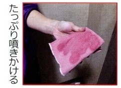 - ①クロスにトレシモンハードをたっぷり噴きかけます。