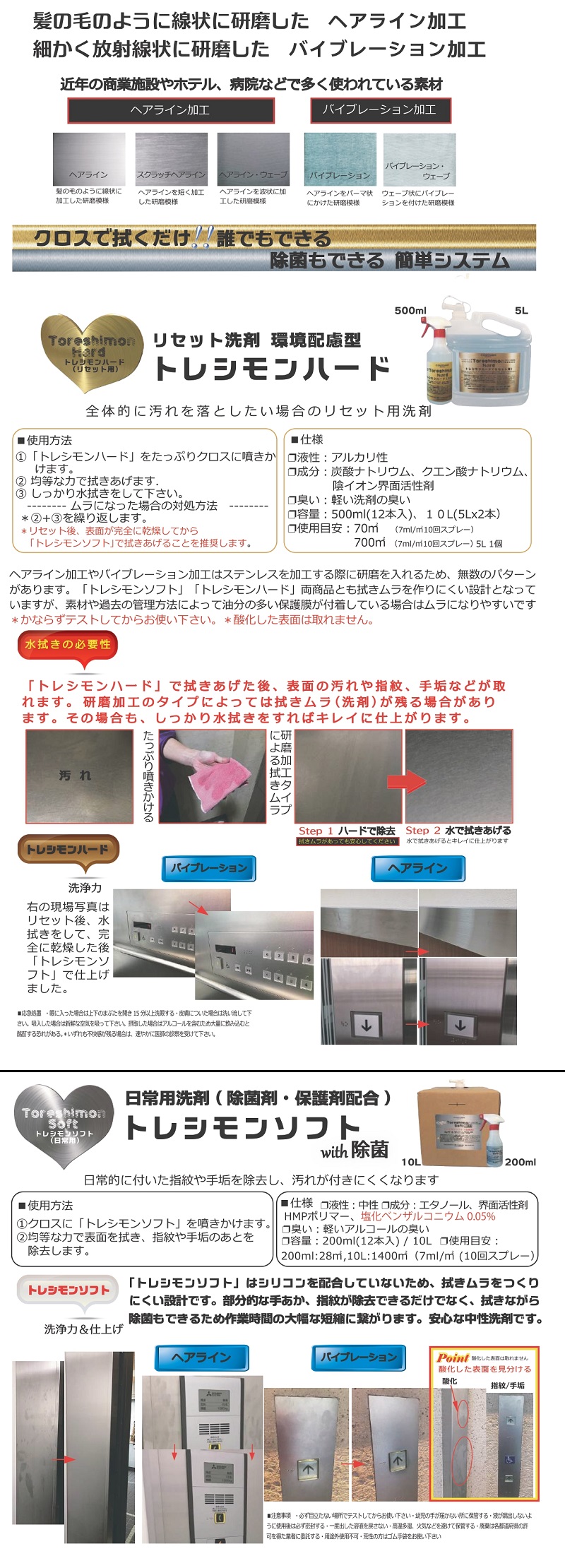 - ヘアライン加工やバイブレーション加工はステンレスを加工する際に研磨を入れるため、無数のパターンがあります。【トレシモンソフト】【トレシモンハード】両商品とも拭きムラを作りにくい設計となっていますが、素材や過去の管理方法によって油分の多い保護剤膜が付着している場合は、ムラになりやすいです。必ず目立たない場所でテストしてからお使い下さい。
